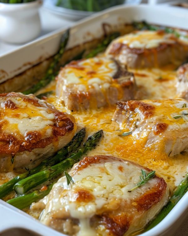 2. Krydda fläskkotletterna med olivolja, vitlökspulver, timjan, paprika, salt och peppar. Bryn varje kotlett i en stekpanna på medelvärme i ca 2 minuter per sida och lägg sedan i formen. 3. Strö morötter, sparris, sockerärtor och lök runt och mellan fläskkotletterna.