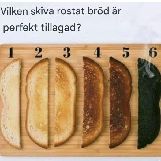 Vid första anblicken verkar bilden enkel: sex skivor rostat bröd, prydligt arrangerade och numrerade 1 till 6, som var och en representerar en annan grad av tillagning. Skiva 1 är lätt rostad, blek och mjuk, medan skiva 6 är helt bränd, mörk och rykande. Frågan ovanför bilden – "Vilken skiva rostat bröd är perfekt tillagad?" – verkar lekfull, men inbjuder till förvånansvärt djup reflektion.