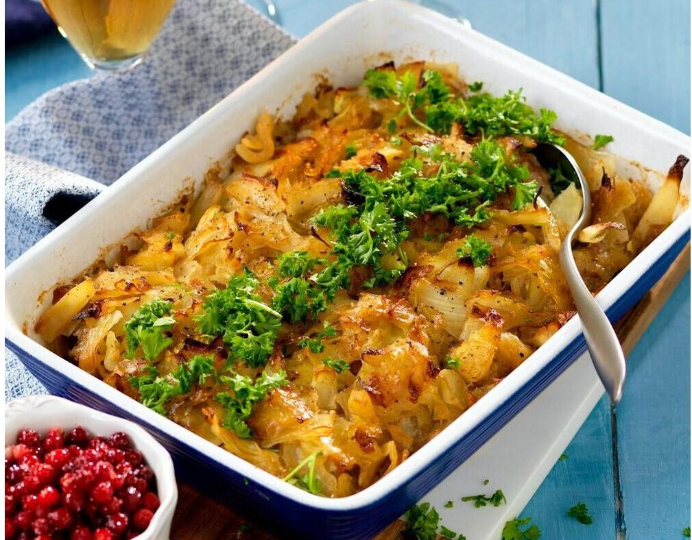 Vitkålsgratäng med köttfärs och tranbär